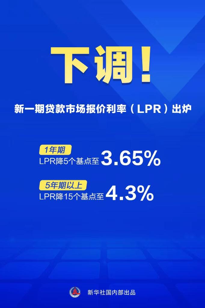 當(dāng)日,中國人民銀行授權(quán)全國銀行間同業(yè)拆借中心公布,1年期LPR為3.65%,5年期以上LPR為4.3%,分別較上一期下調(diào)5個(gè)和15個(gè)基點(diǎn)。